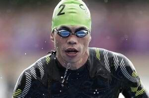 游泳是三项赛的第一项,在悉尼奥运会上将设置一座浮桥,运动员们从浮桥上同时跳水出发。他们要沿着由浮标和绳索标志出的三角形路线前进,如果有人超近道就会受到处罚。运动员可以用他们喜欢的任何姿势游泳,但实际上所有的运动员都选择自由泳。